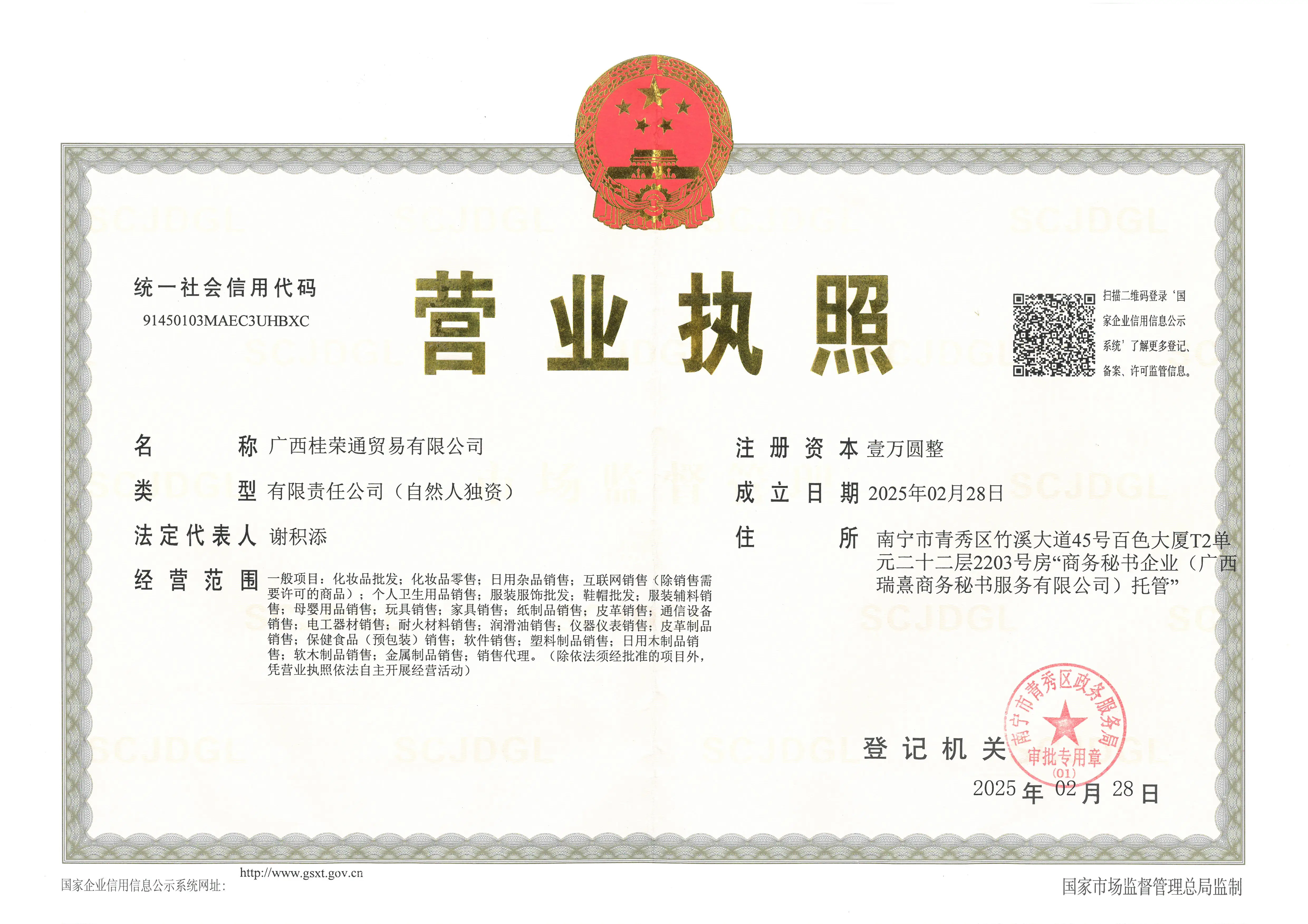 Registered address : Room 2203, 22nd Floor, Unit T2, Baise Building, No. 45 Zhuxi Avenue, Qingxiu District, Nanning City Business Secretary Enterprise Custody Nanning Guangxi China